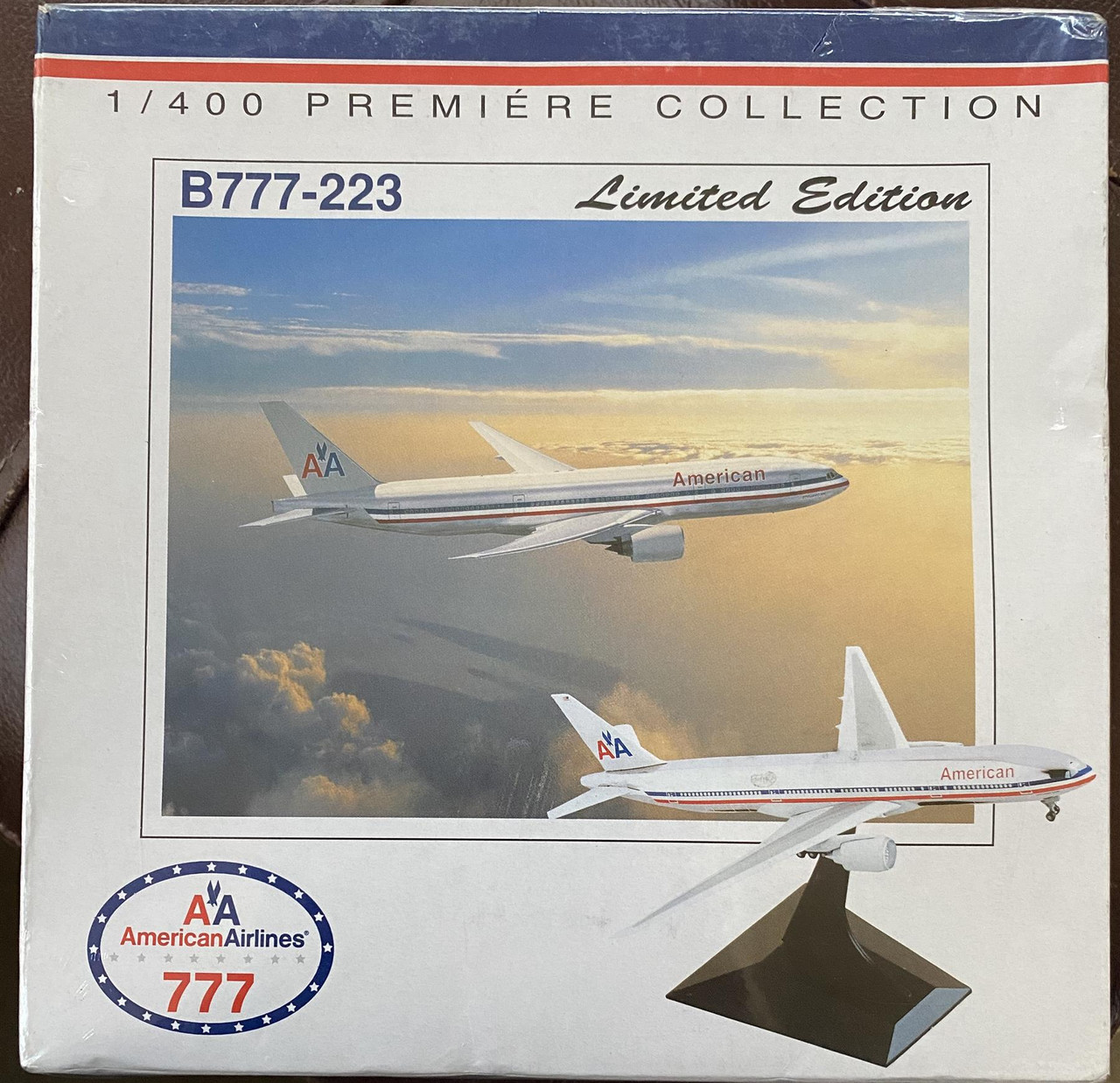 This is a rare limited edition model from Dragon Wings of the B777-223 aircraft in the colors of American Airlines. This is a model that was produced for the airline and then used by the airline for VIP and promotional purposes around the launch of B777-223 service "expected to begin in 1999". Model is in a sealed new box.