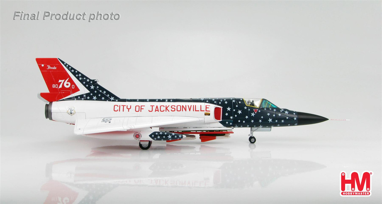 This is a 1:76 scale die-cast airpower series model airplane from HobbyMaster of the F-106A Delta Dart aircraft in the City of Jacksonville, Florida ANG, 1976 colors. Model is 11.75 inches long with a wingspan of 6.25 inches.